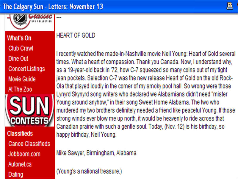 I recently watched the made-in-Nashville movie Neil Young: Heart of Gold several times. What a heart of compassion. Thank you Canada. Now, I understand why, as a 19-year-old back in '72, how C-7 squeezed so many coins out of my tight jean pockets. Selection C-7 was the new release Heart of Gold on the old Rock-Ola that played loudly in the corner of my smoky pool hall. So wrong were those Lynyrd Skynyrd song writers who declared we Alabamians didn't need "mister Young around anyhow," in their song Sweet Home Alabama. The two who murdered my two brothers definitely needed a friend like peaceful Young. If those strong winds ever blow me up north, it would be heavenly to ride across that Canadian prairie with such a gentle soul. Today, (Nov. 12) is his birthday, so happy birthday, Neil Young.